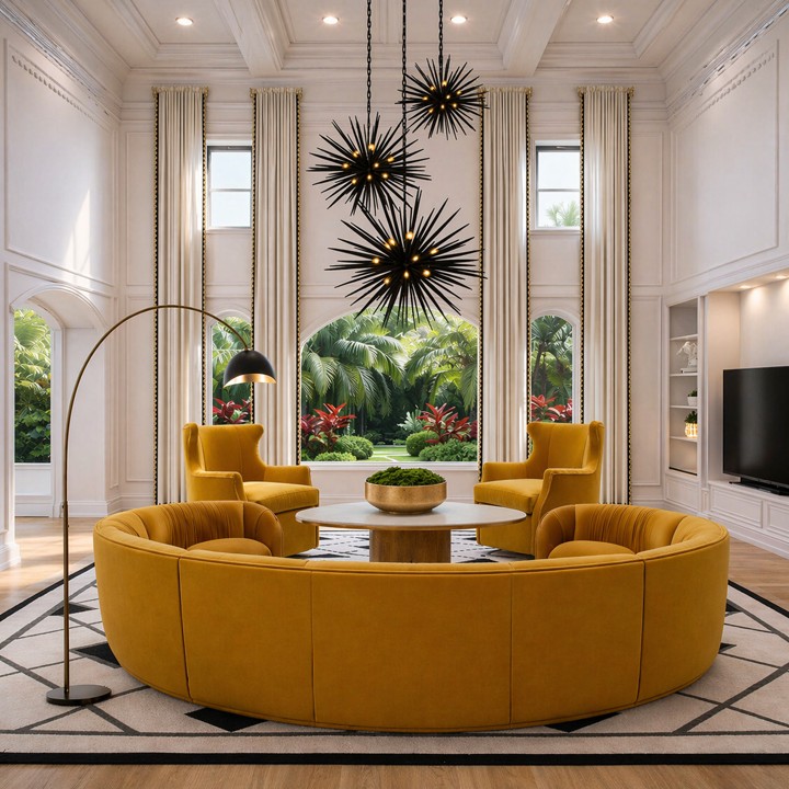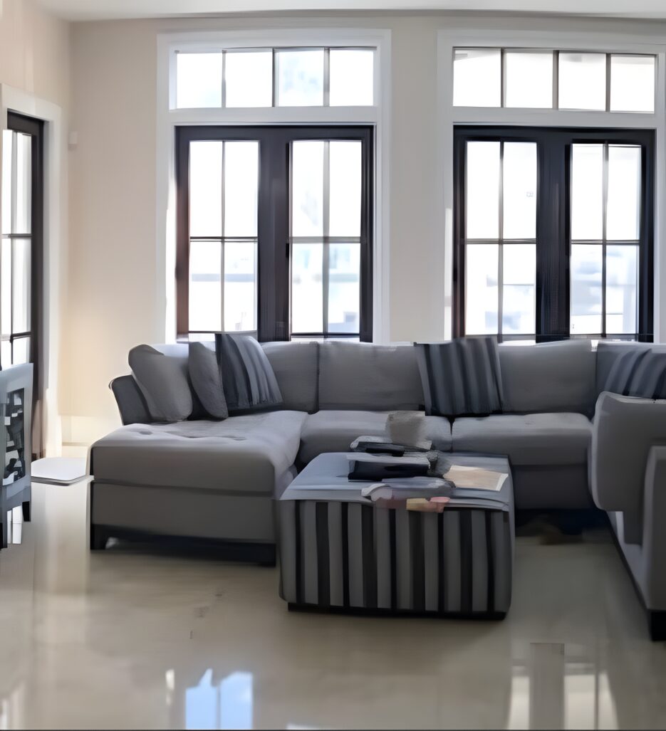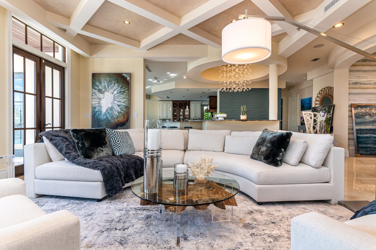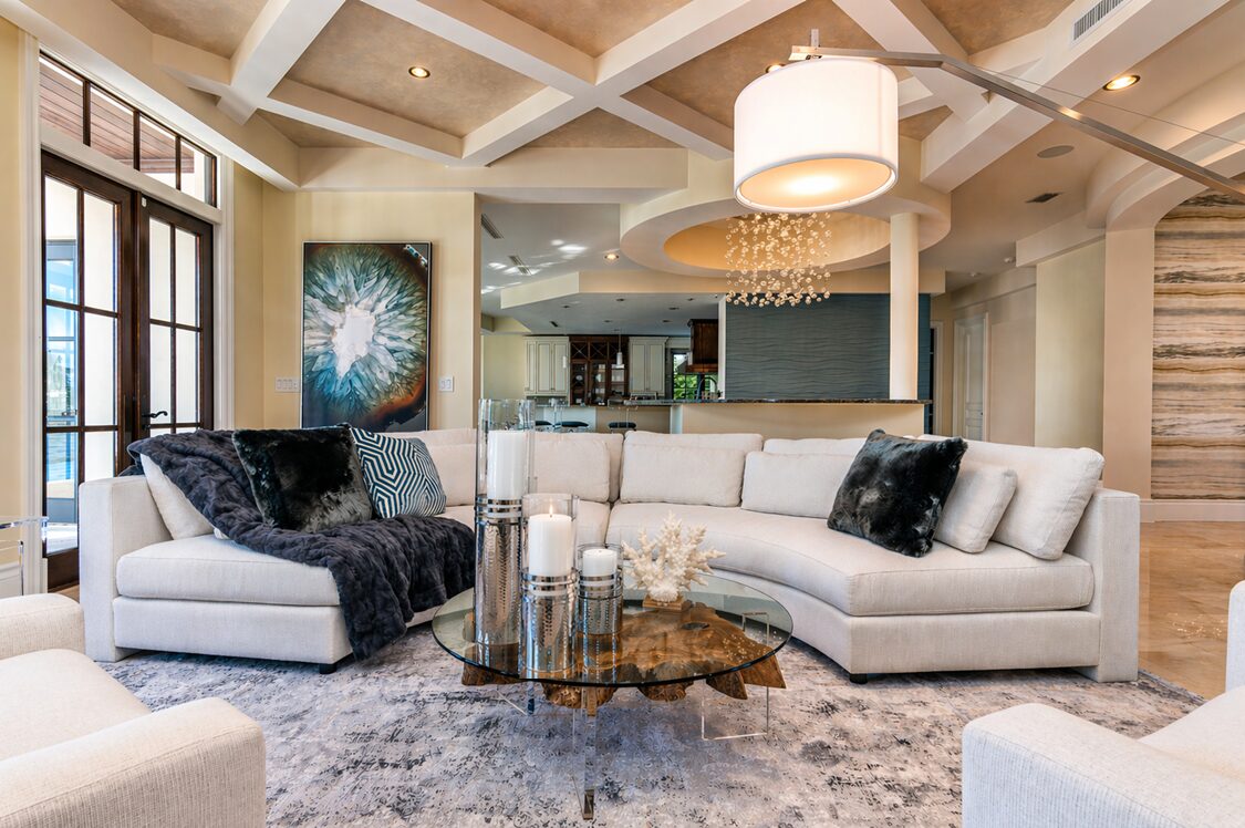 From traditional and visually busy to open and cohesive. A custom U-shaped sectional, layered lighting, and sculptural details redefine this living space with comfort and flow.