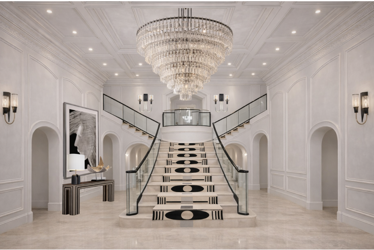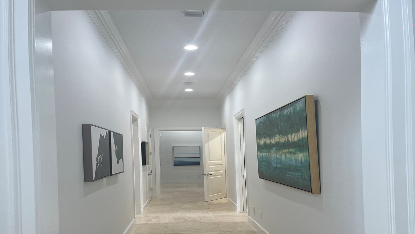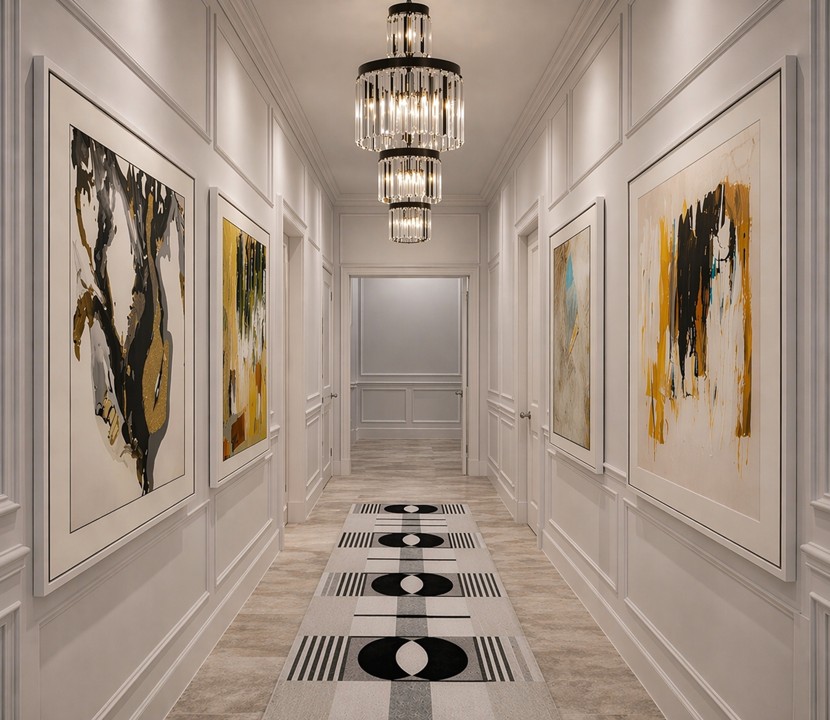From a plain passageway to a refined gallery-style corridor. Custom wall detailing, curated artwork, and statement lighting turned a transitional space into a destination.