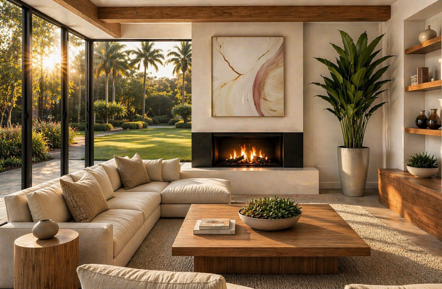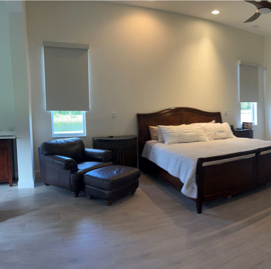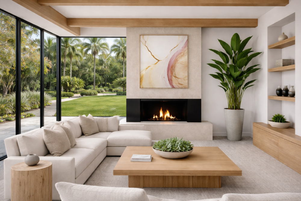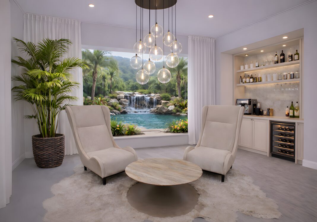 From a simple, sparsely furnished room to a warm, inviting lounge. Thoughtful seating, layered lighting, and a framed pool view transformed the space into a relaxing retreat.
