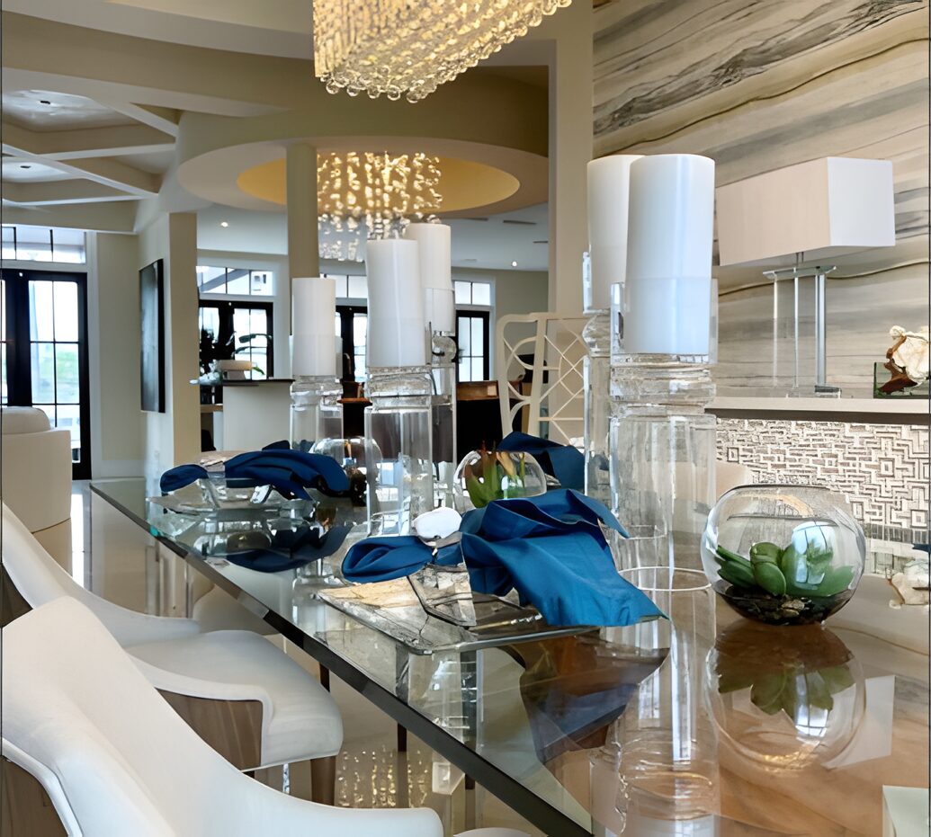 From traditional and understated to bright and refined. Thoughtful styling, modern lighting, and coastal accents bring warmth and sophistication to this dining area.