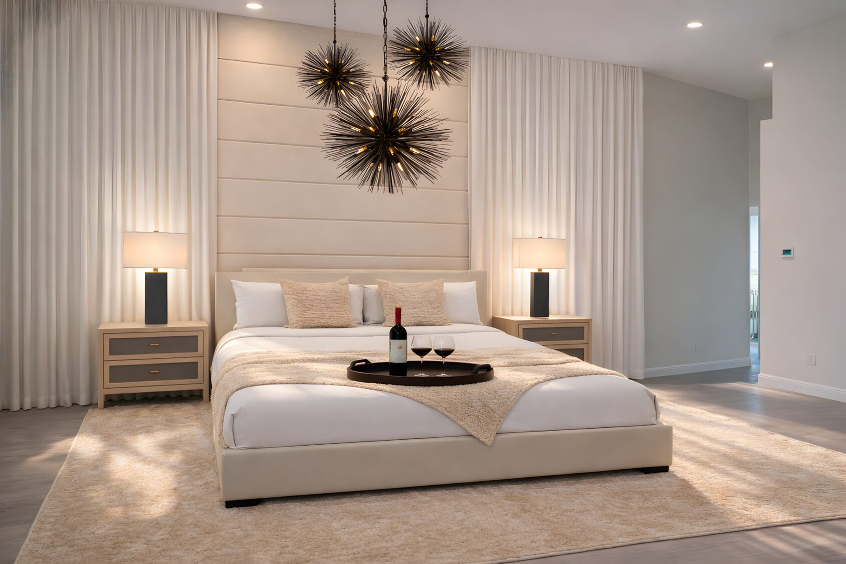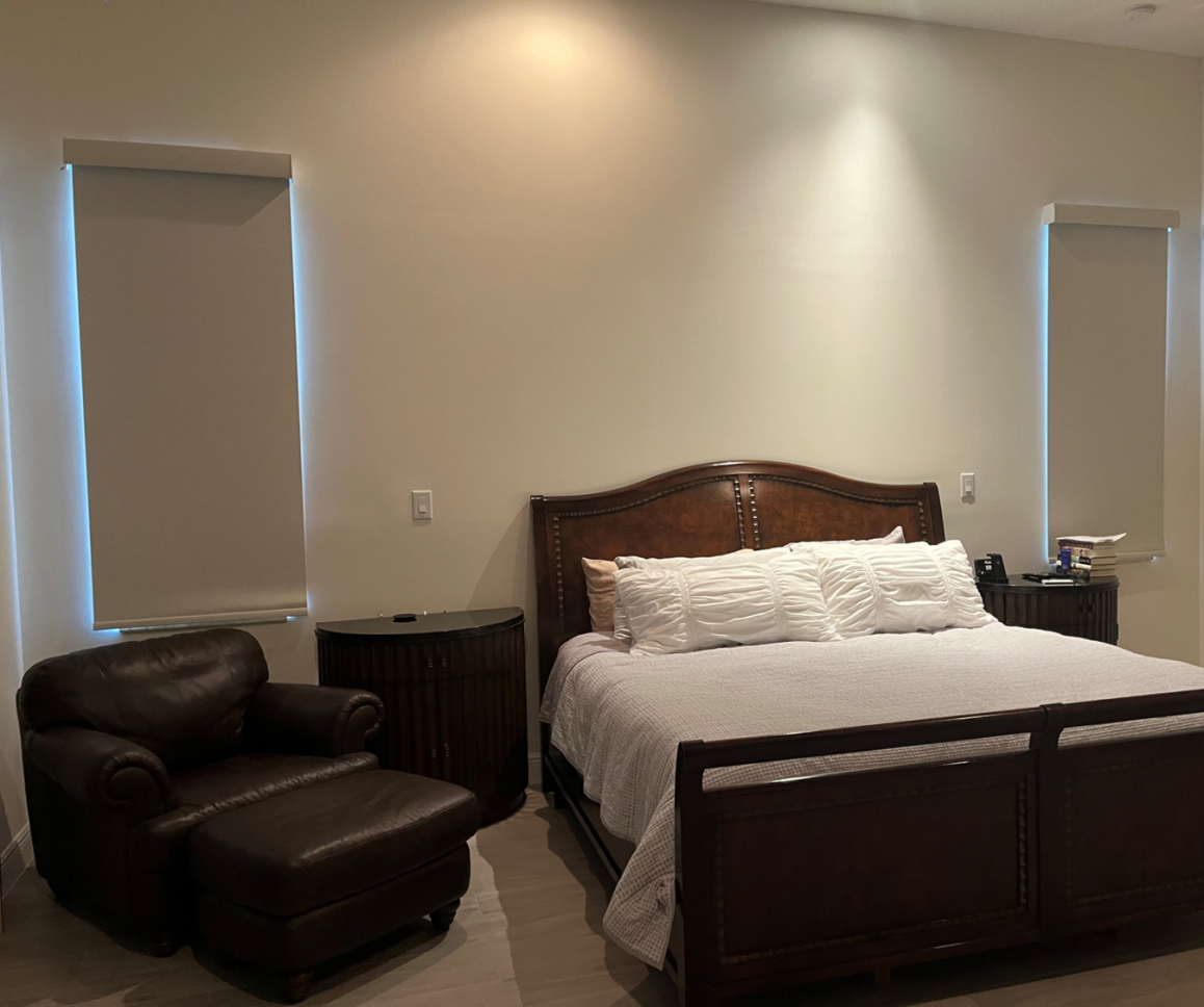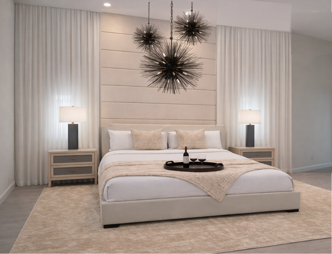 Once basic and uninviting, this bedroom is now warm and cohesive. Neutral textures, tailored lighting, and thoughtful styling create a space designed for rest and comfort.