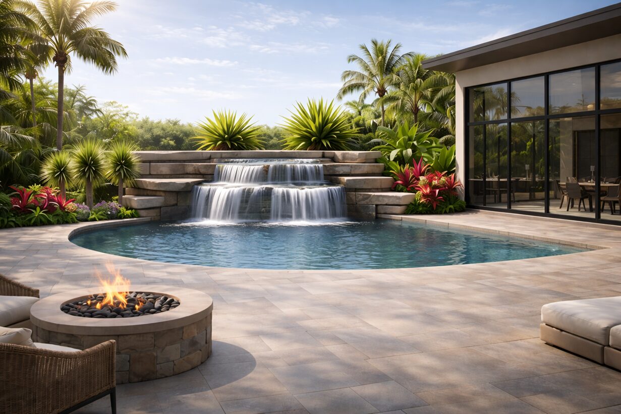 From ordinary and underutilized to a lush tropical sanctuary. Natural stone terraces, sculpted greenery, and a cascading waterfall introduce movement, texture, and depth, transforming a simple pool area into a serene, resort-style escape designed for beauty, comfort, and refined outdoor living.